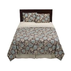 This pretty comforter set includes comforter, shams and bedskirt. It has a blue and brown floral pattern that is accented with brown stripes. It's a great look! Pretty queen size comforter set Brown and blue floral pattern Comforter reverse and bedskirt is brown and ivory stripes Comforter measures, 88" by 94" 2 standard pillow shams, 20" by 26" Queen size bedskirt Made from 100% cotton (excluding bedskirt platform) 100% polyester fill Machine wash Brand name is Home